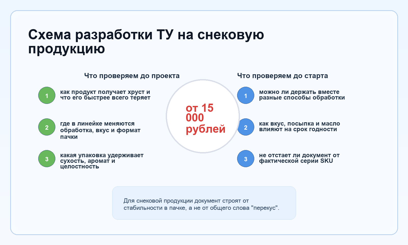 Для снека недостаточно просто перечислить состав и упаковку. В документе должны быть закреплены признаки, которые и делают продукт снэком в потребительском смысле: сухость, хруст, целостность, стабильность вкуса и поведение в пачке до конца срока.