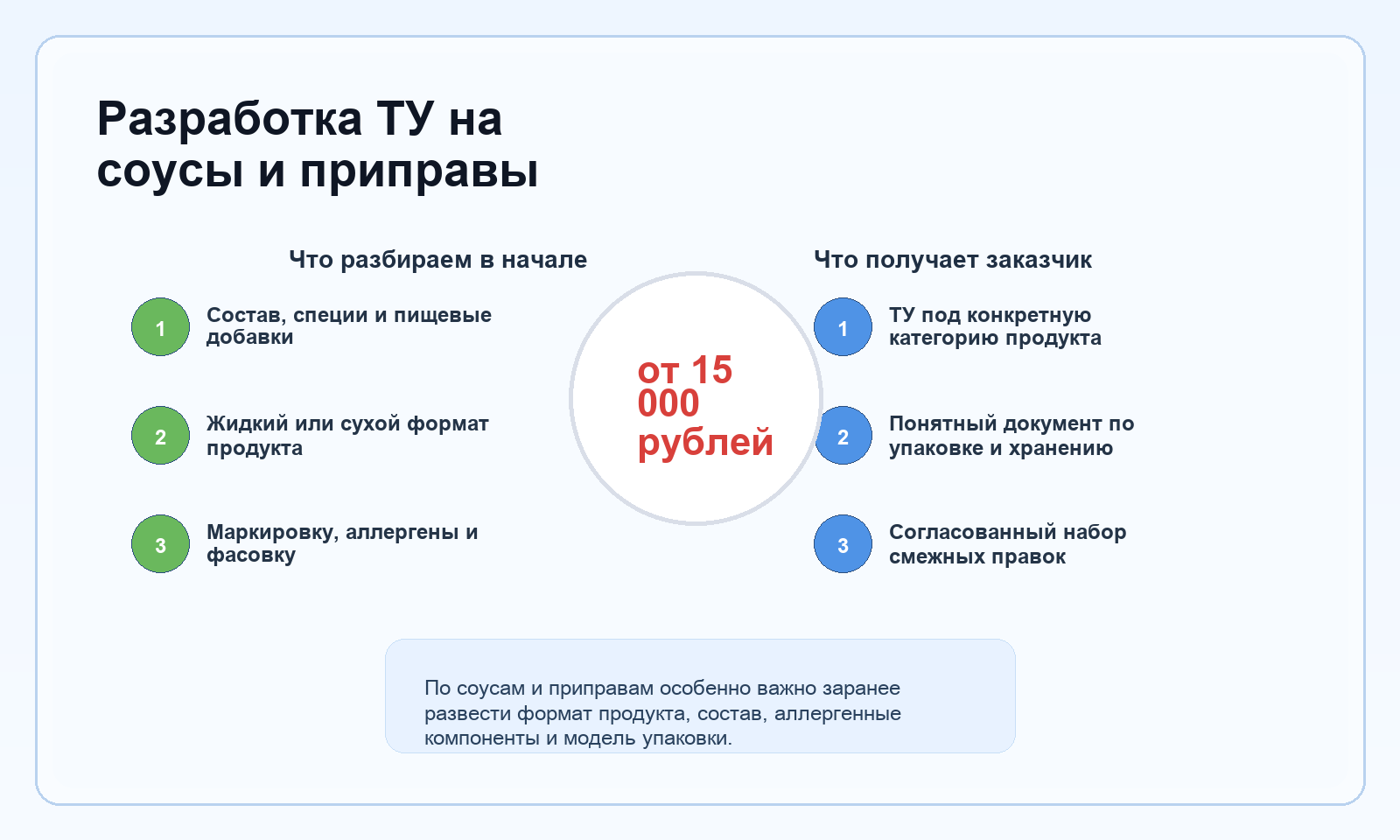 По соусам и приправам документ часто устаревает незаметно. Добавили новый вкус, заменили носитель, изменили кислотность, перешли на другой объем фасовки или внесли аллергенный компонент — и старый текст ТУ уже не совпадает с реальной продукцией, хотя визуально ассортимент почти не изменился.